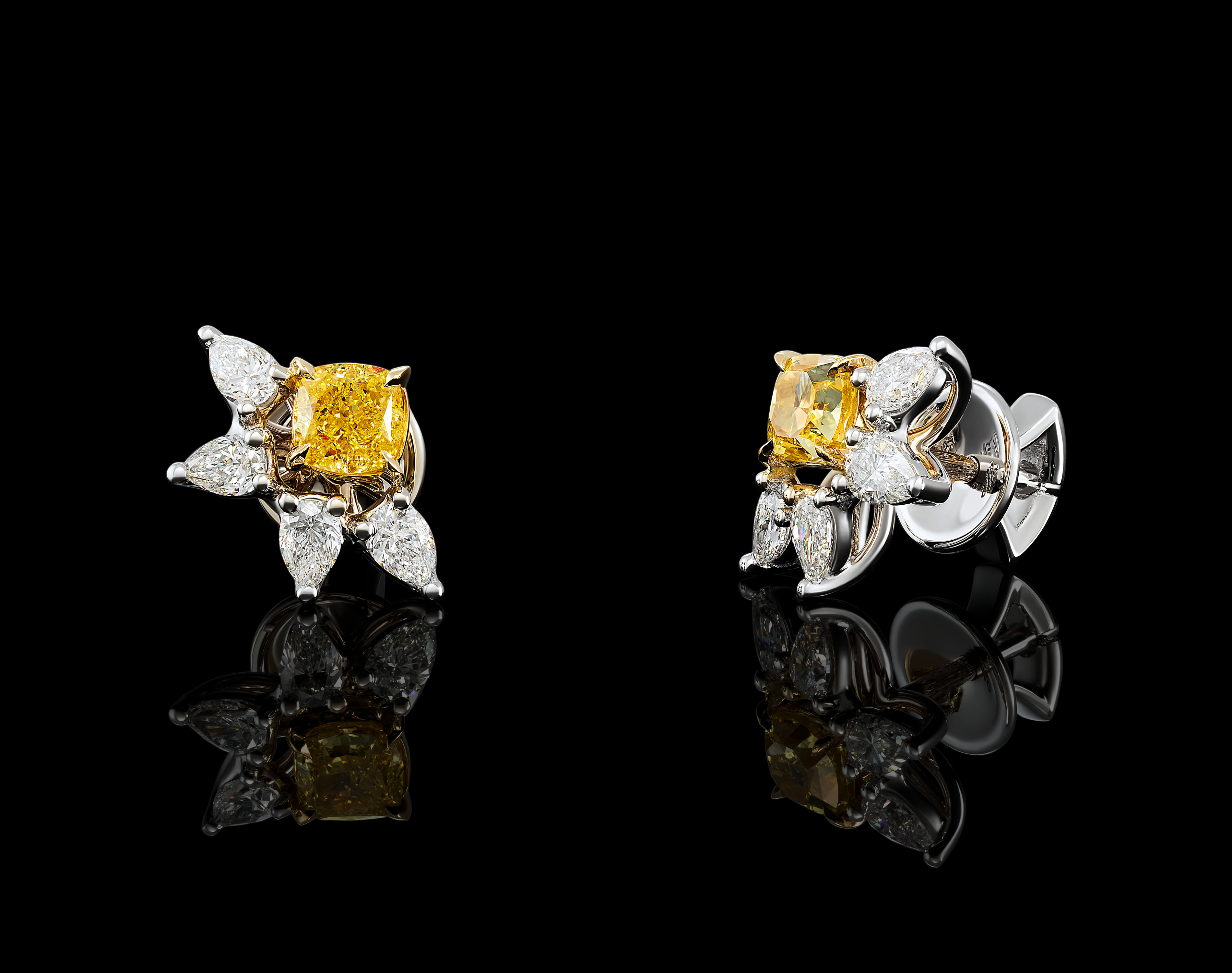 Серьги из белого и жёлтого золота 750 пробы (18 карат) с бриллиантами огранки капля общим весом 0.67 кр. и изумрудами огранки октагон общим весом 1.20 кр. Вес изделия: 3.84 гр.